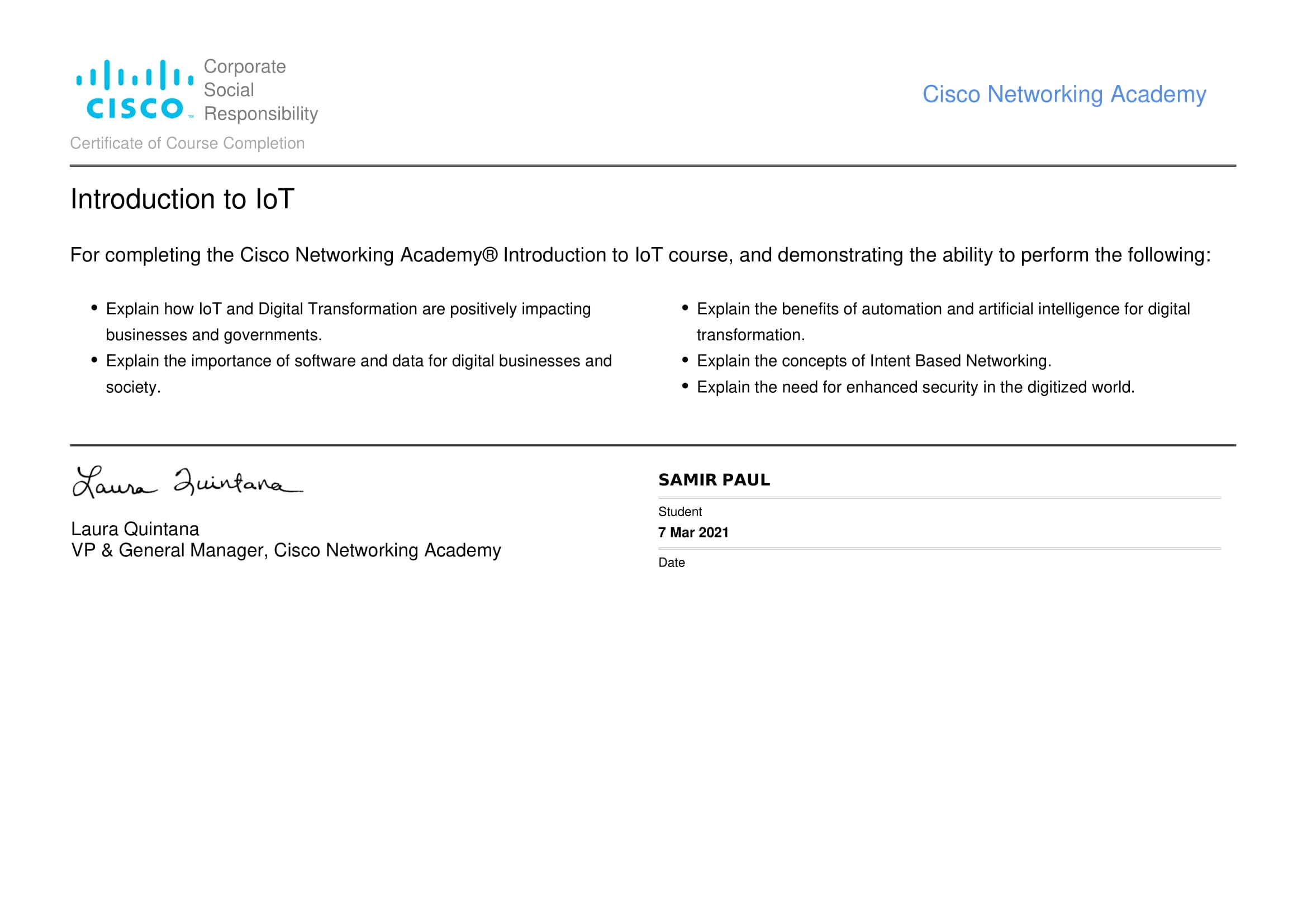 Cisco Networking Academy: Introduction to IoT and Digital Transformation